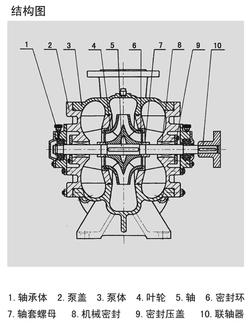 該泵轉向從聯(lián)軸器方向看泵為順時針方向旋轉時,為右面入水,左面出水,如果從聯(lián)軸器看泵為逆時針方向旋轉時,泵為左面入水,右面出水,需要何種轉向,訂貨時說明。否則,出廠時一律按順時針旋轉方向。
