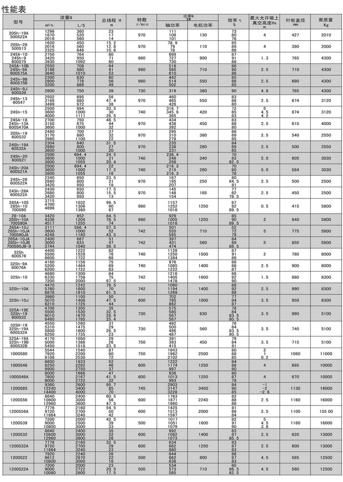 Sh.S.SA型泵是單級,雙吸,泵殼水平中開式離心泵,供輸送清水及物理化學性質類似于水的液體之用。介質溫度80℃,若兩端軸承通以冷卻水,介質可達130℃。改變葉輪,密封環和軸封的材料,可以汲送含有泥沙的渾水,泵的軸封一般采用軟填料,如有特殊訂貨要求,也可裝機械密封。