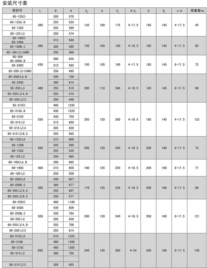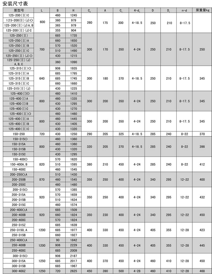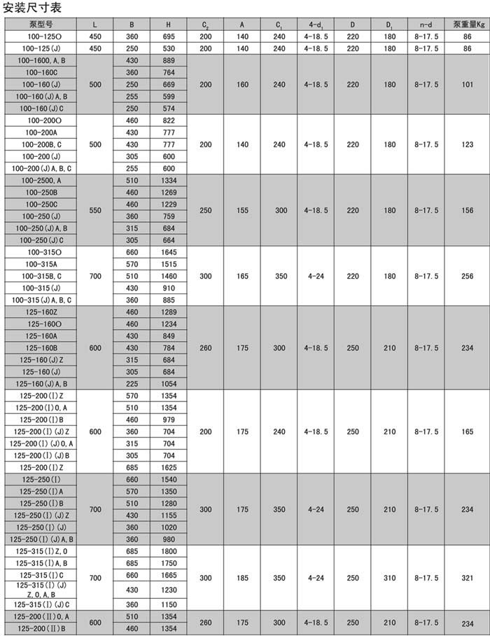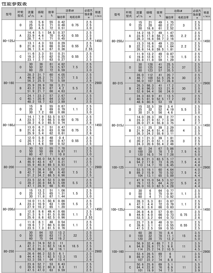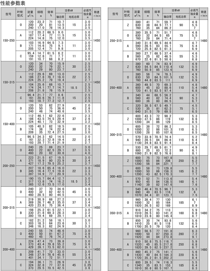 采用ISO2858國際標準,流量范圍:1.5—1600m3/h,揚程:8—125m,汽蝕余量2.5—7m,每種型號泵通常分為Z.O.A.B.C五種型式,共有291個規格。